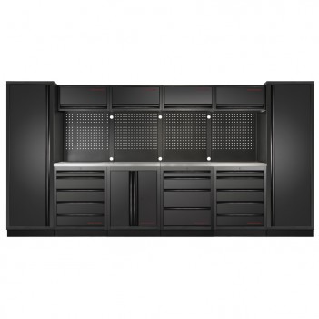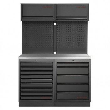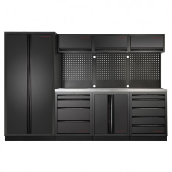 Werkstattmöbel 6-teilig Mobilio schwarz 3964C-BLK KraftwerkDie 6-teiligen Werkstattmöbel Mobilio schwarz 3964C-BLK Kraftwerk kombinieren Hochschränke, Schubladenschränke, Unterschränke und Lochplatten für eine optimierte Aufbewahrung. Erhältlich mit einer Standardarbeitsplatte aus Buche oder Edelstahl oder in großer Tiefe aus Buche (Modell EX).