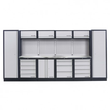 Werkstattmöbel 6-teilig Mobilio 3964C KraftwerkDie 6-teiligen Werkstattmöbel Mobilio 3964C Kraftwerk kombinieren Hochschränke, Schubladenschränke, Unterschränke und Lochplatten für eine optimierte Aufbewahrung. Erhältlich mit einer Standardarbeitsplatte aus Buche oder Edelstahl oder in großer Tiefe aus Buche (Modell EX).