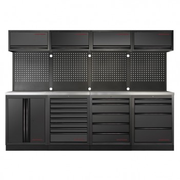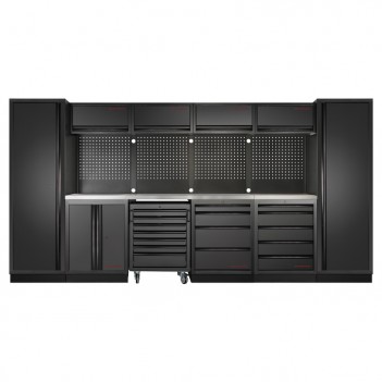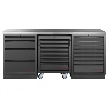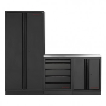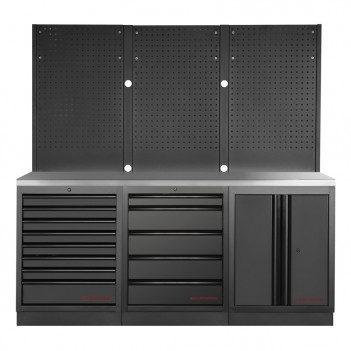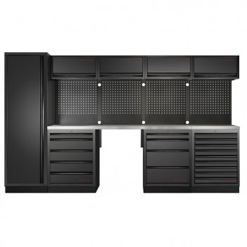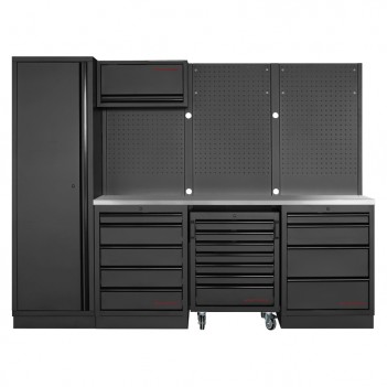 3-teiliges Werkstattmobiliar Mobilio schwarz 3964K-BLK-005 Kraftwerk3-teilige Werkstattmöbel Mobilio schwarz 3964K-BLK-005 Kraftwerk: Komplettlösung mit 13 Schubladen, 3 Oberschränken und 3 Lochplatten für eine optimierte Aufbewahrung. Arbeitsplatte je nach Bedarf in Buche oder Edelstahl erhältlich.