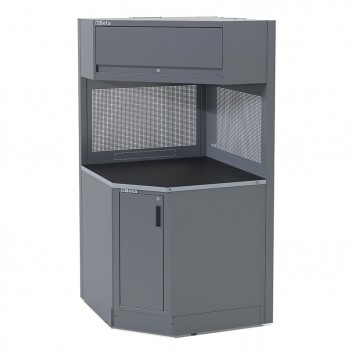 Komplettes freistehendes Eckmöbel RSC50 2.0 NAC BetaEckschrank RSC50 2.0 NAC Beta komplett mit Unterschrank, Oberschrank und perforierten Paneelen. Erhältlich in 3 Ausführungen mit einer Tischplatte von 964x964 mm.