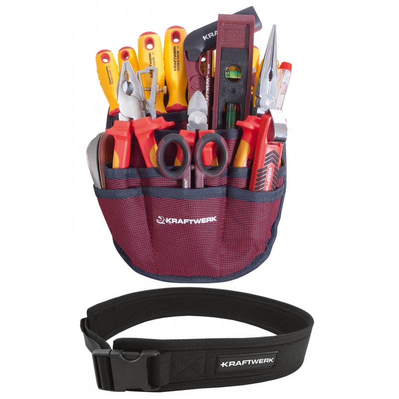 Elektriker-Werkzeugsatz in solider Gürteltasche mit Klettverschluss, bestückt mit 20 speziellen und geprüften Elektrowerkzeugen.