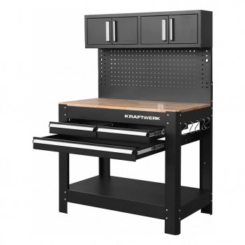 Établi en acier 1142mm avec 3 tiroirs et 2 meubles hauts KraftwerkL'établi en acier 1142 mm avec 3 tiroirs et 2 meubles hauts Kraftwerk offre un plan de travail robuste en bois FSC, des rangements pratiques et une grande stabilité.