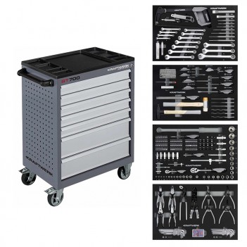 Servante d'atelier BASIC LINE BT700, 7 tiroirs, 337 pcs (deux couleurs) KraftwerkServante d'atelier BASIC LINE BT700, 7 tiroirs Kraftwerk équipée de 337 outils dans 4 inserts spéciaux en mousse souple haute densité (EVA) 60 x 40 cm. Fabriquée en Allemagne.