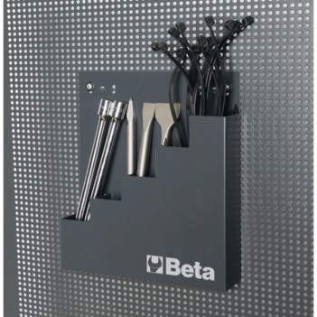 Le support mural SP5S de Beta est conçu pour les panneaux muraux de la gamme C45PRO 2.0. Il dispose de cinq compartiments de hauteurs différentes, permettant de ranger efficacement divers outils, bombes aérosols, flacons ou documents, directement à portée de main.