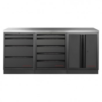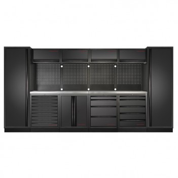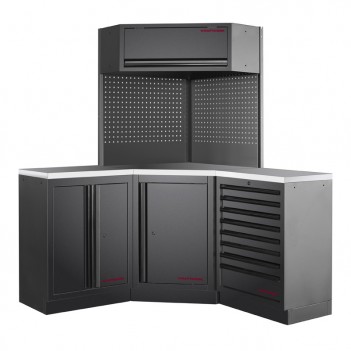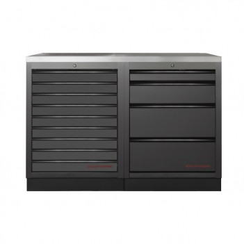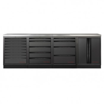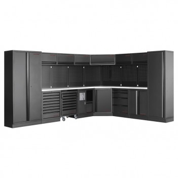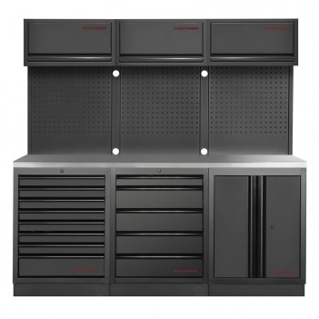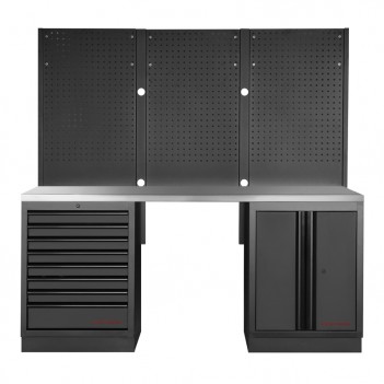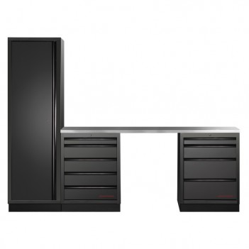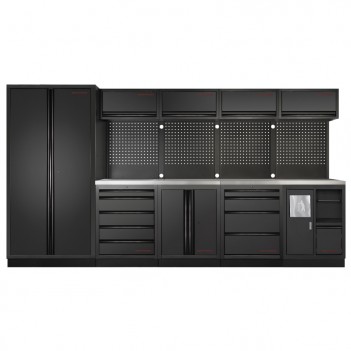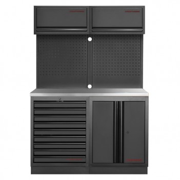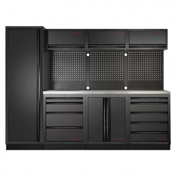 Le mobilier d'atelier 6 éléments Mobilio noir 3964C-BLK Kraftwerk combine armoires hautes, meubles à tiroirs, meuble bas et panneaux perforés pour un rangement optimisé. Disponible avec un plan de travail standard en hêtre ou inox, ou en grande profondeur en hêtre (modèle EX).