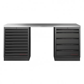 Pour une organisation parfaite de vos outils et petites pièces, trois armoires à tiroirs le garantissent. Deux des armoires offrent chacune cinq tiroirs à billes, tandis que la troisième armoire est équipée de quatre tiroirs. Ceux-ci sont construits dans différentes hauteurs, permettant d'optimiser le tri de vos outils. Les tiroirs peuvent être verrouillés individuellement et sont verrouillables centralement, offrant une sécurité supplémentaire. Ainsi, vous avez toujours un accès rapide à ce dont vous avez besoin et pouvez garder votre atelier propre et ordonné.